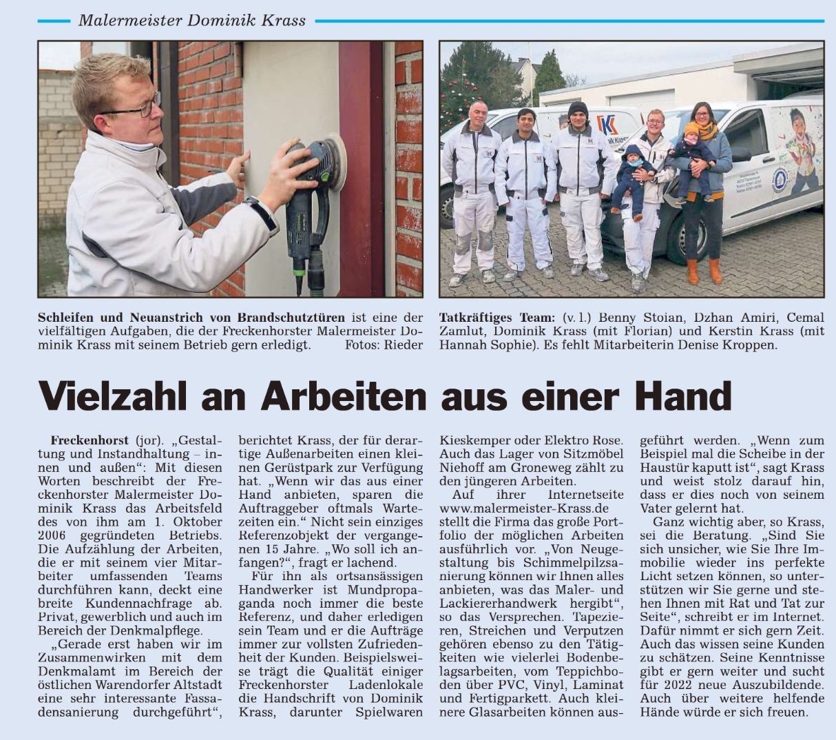 Seit dem 01.10.2006 steht unser Malerbetrieb mit Sitz an der Feidiekstraße 14 in Warendorf-Freckenhorst für hochwertige Malerarbeiten im Innen- und Außenbereich sowie professionelle Bodenverlegung.